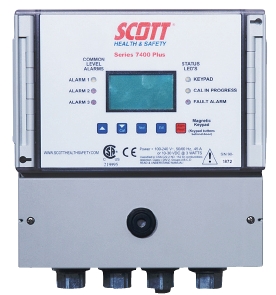 The 3M Scott Safety 7400 Plus Controller is designed to provide simultaneous display and alarm functions for up to four monitored variables.