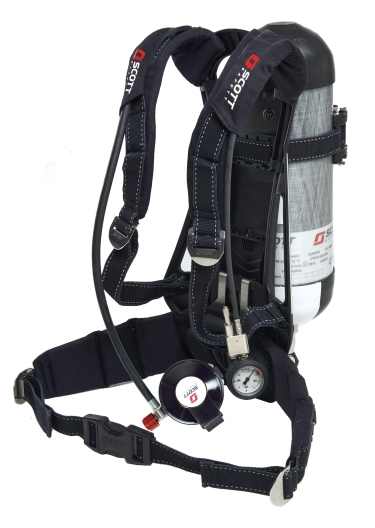 The 3M Scott Safety ProPak-F-EZ-FLO is a Type 2 open circuit, self-contained, compressed air breathing apparatus. It consists of a back plate, padded carrying harness and pneumatic system, containing a cylinder connector, reducer, pressure gauge, whistle and demand valve.