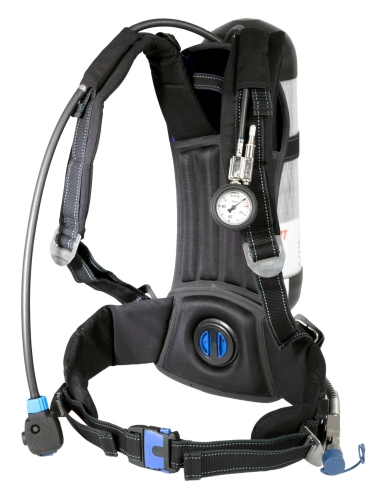 The Scott ACSfx is an open circuit, self-contained, compressed air breathing apparatus. It consists of an adjustable back plate, padded carrying harness and pneumatic system, containing a cylinder connector, reducer, pressure gauge, whistle and demand valve.