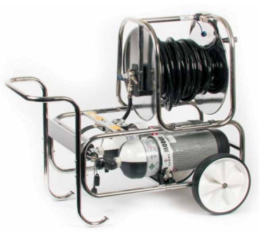 Versatile and robust, it consists of a lightweight stainless steel hose reel unit and cylinder frame that can be used independently or together. The frame is designed to carry a pair of cylinders and, where required, an additional frame can be vertically stacked to allow connection of up to four cylinders. This, in conjunction with proven 300 bar high performance pneumatics delivering up to 1000 litres of breathing air per minute, permits four people to work at the same time.