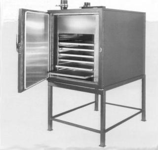 The chamber is fitted with 6 pairs of shelf runners on 90mm centres; twelve aluminium trays are supplied. The trays slide directly on the shelf runners. The oven accepts two shelves per level to give a total tray area of 4.32 square metres;