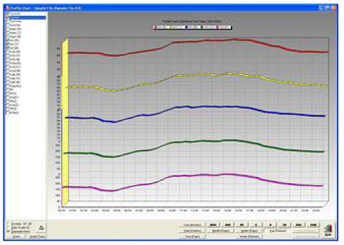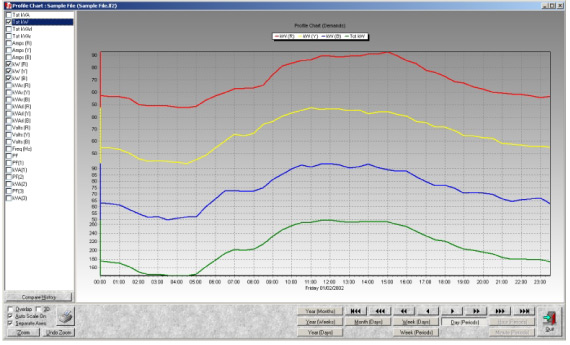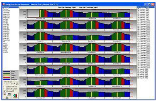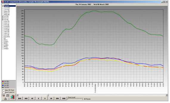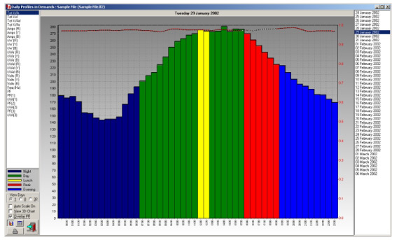 | Select the item to be graphed from the list on the left and the date for the data on the right. Right click with the mouse to zoom out to 8 and 32 day views. Left click to zoom into a specific day. Data is displayed as price bands represented by colours. Power factor is also displayed with loadings logger data file for automatic retrieval each time you load that specific data. |