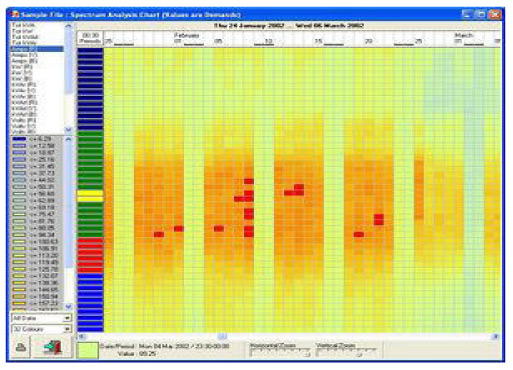Spectrum Analysis allows large amounts of data to be viewed clearlyand high energy use (red) and Low (blue) located quickly. Patterns of energy use or non use can be seen as coloured energy contours..