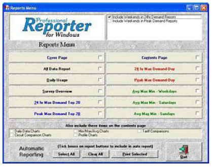 Reporter Professional is a software program to enable the user to interface with the most popular energy loggers. Communications to the logger is built in, enabling the user to download data directly from the logger. Support is also provided to import files from other loggers and selected electricity company metering half hourly data files. Reports, graphs & charts are produced by an automated process after the user has selected the reports they require from a simple menu system. A comprehensive and easy to use Tariff and bill checking facility is also supplied. Comms compatible loggers are Hawk I, II, 3000, 5000, Sinergy E-Tracker & Pro Tracker. Text file compatible loggers are Seltek Pro-file range.