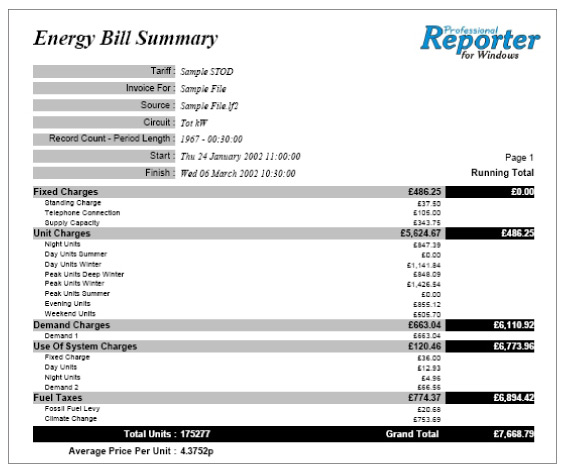 Sample of a bill produced by Reporter Professionals Bill Checking feature. This feature is also used for comparing energy company tariffs enabling you to establish who is cheapest before choosing your energy supplier. |